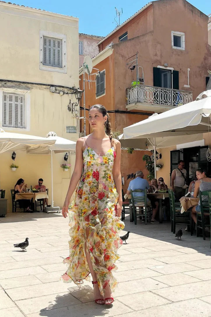 Questo abito lungo e romantico, con stampa floreale vivace e volants svolazzanti, è perfetto per le giornate di sole. Le spalline sottili e la vestibilità fluida donano un tocco femminile e spensierato.